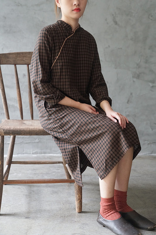 Checked Cheongsam Qipao Dress in Dark Brown