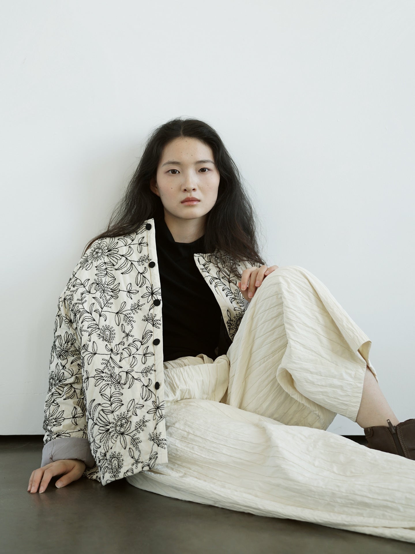 Floral Embroidered Padded Outer Coat in Black