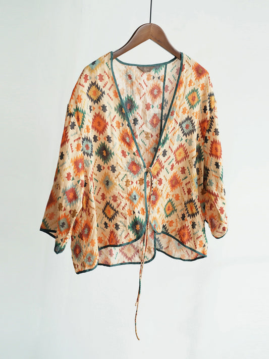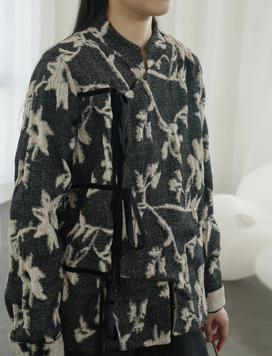 Leafy Textured Cotton Outer Coat with Ribbon