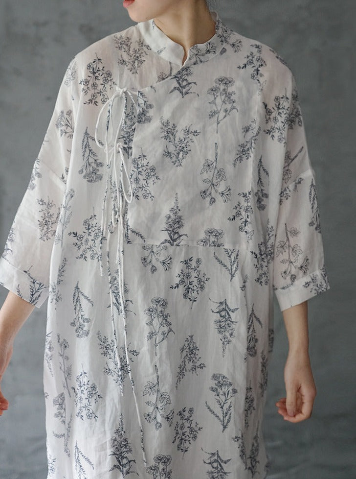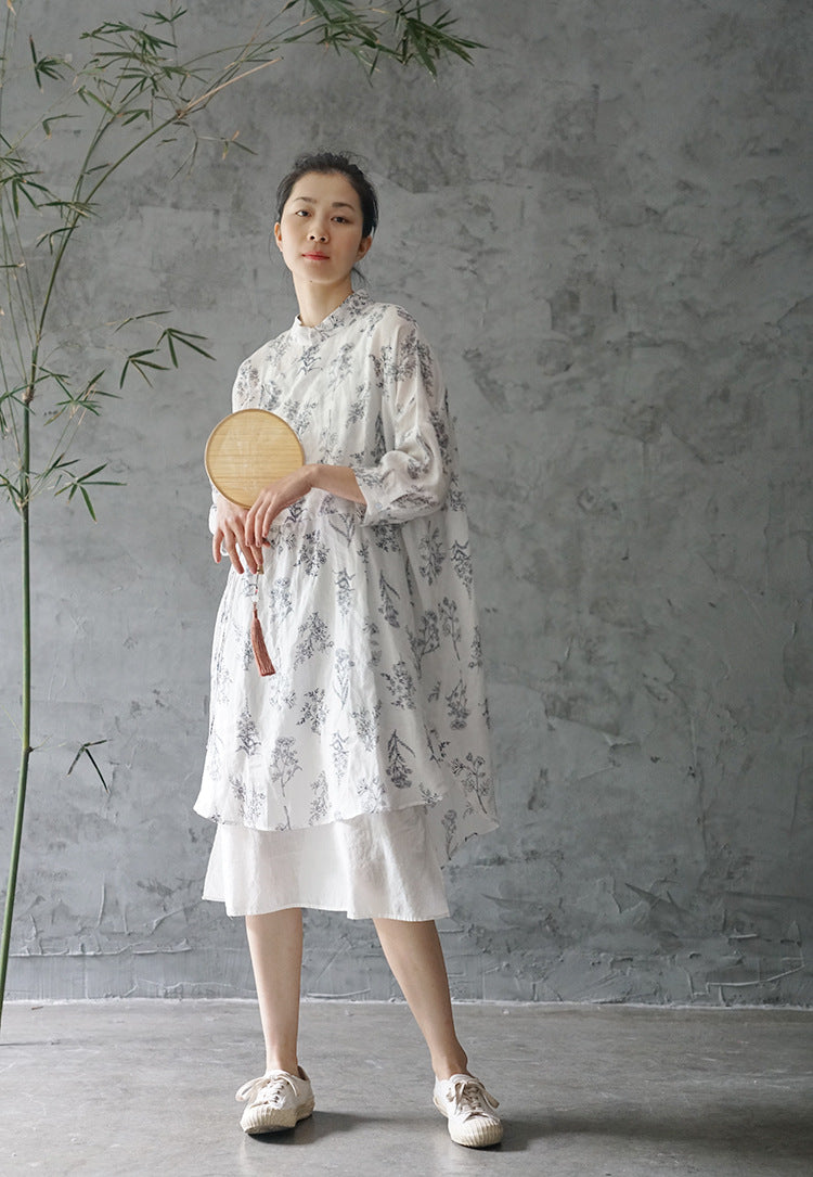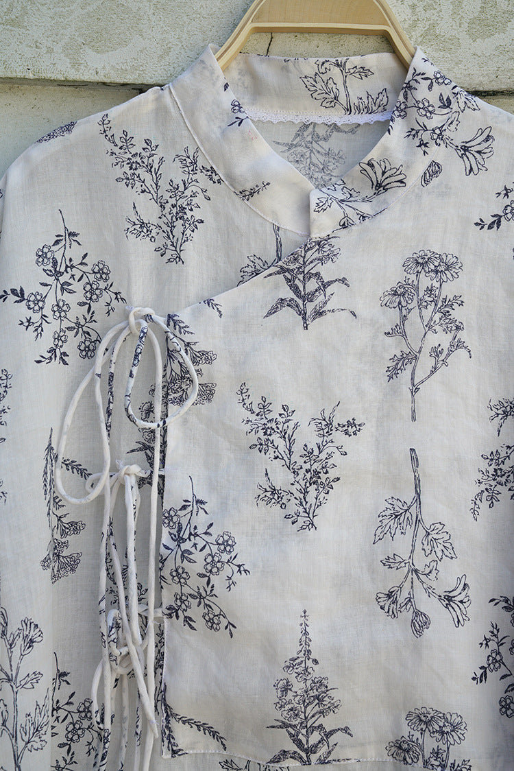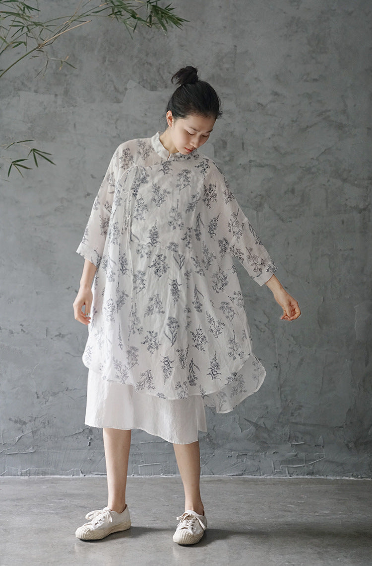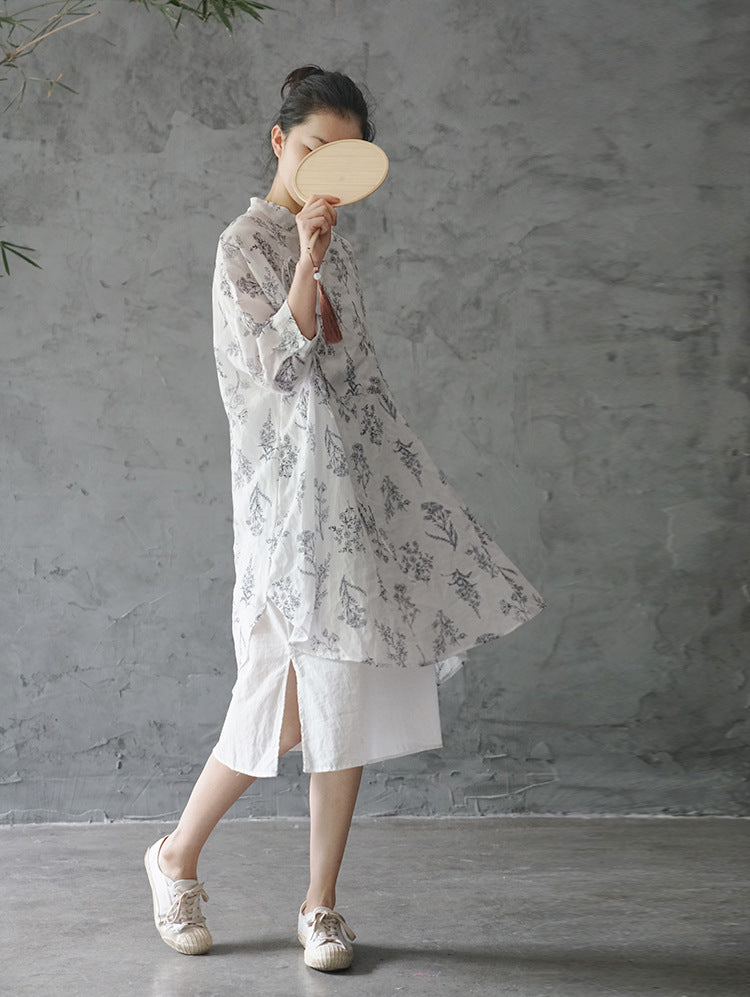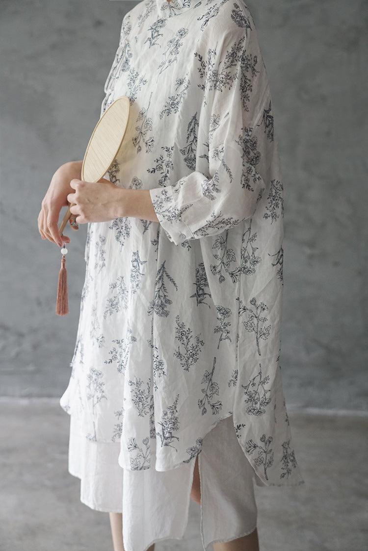 Floral Print Chinese Collar Long Top