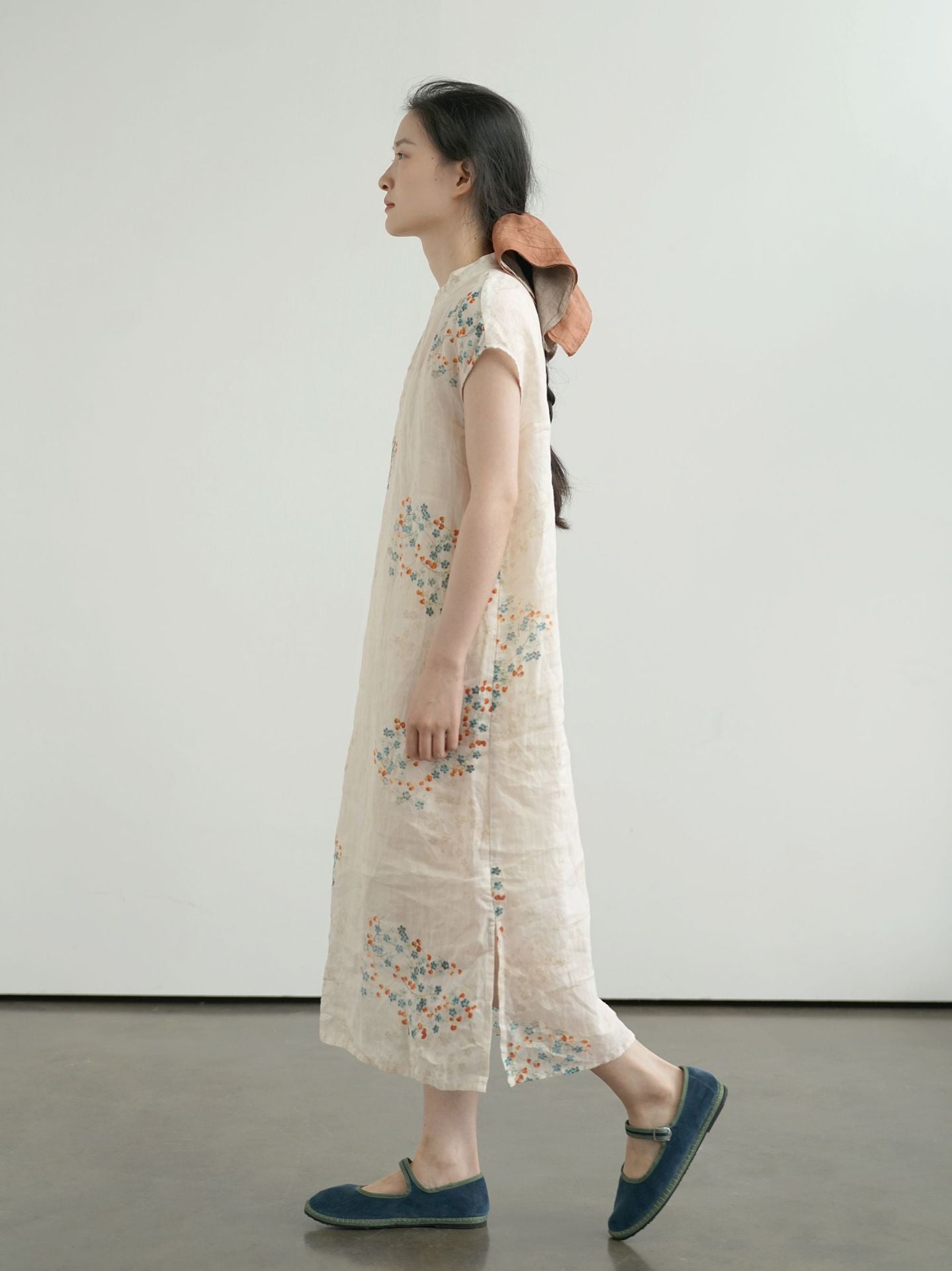 Comfortable Cheongsam dress, digital print on ramie fabric. Two side slits, no pockets.