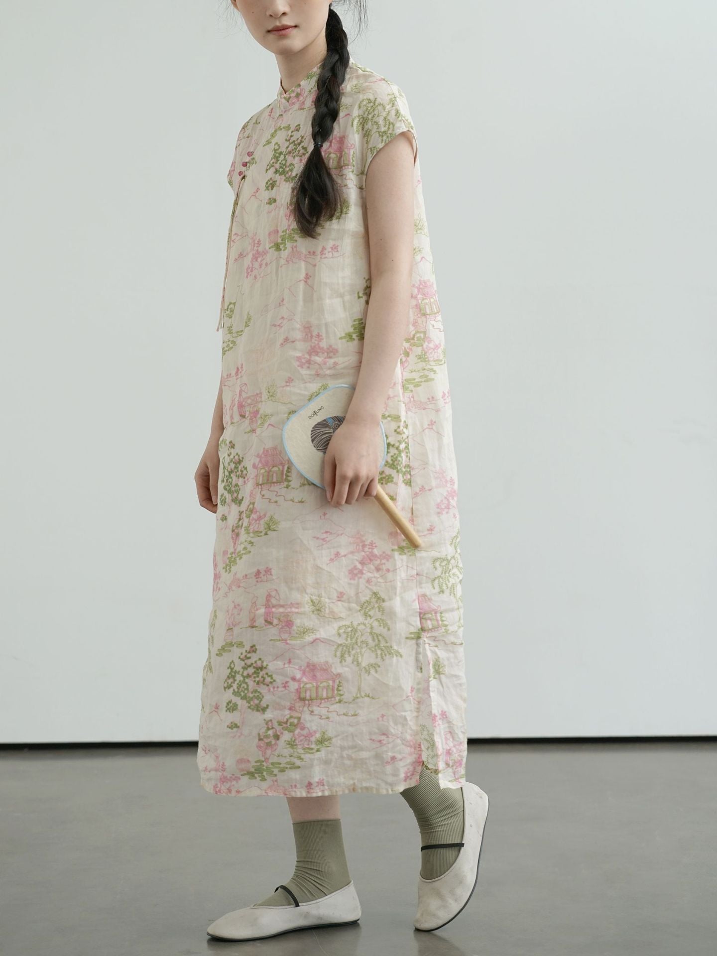 Comfortable Cheongsam dress, digital print on ramie fabric. Two side slits, no pockets.
