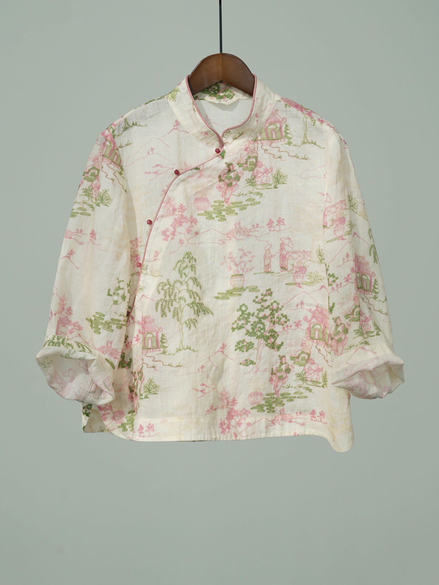 Comfortable Cheongsam top, digital print on ramie fabric.