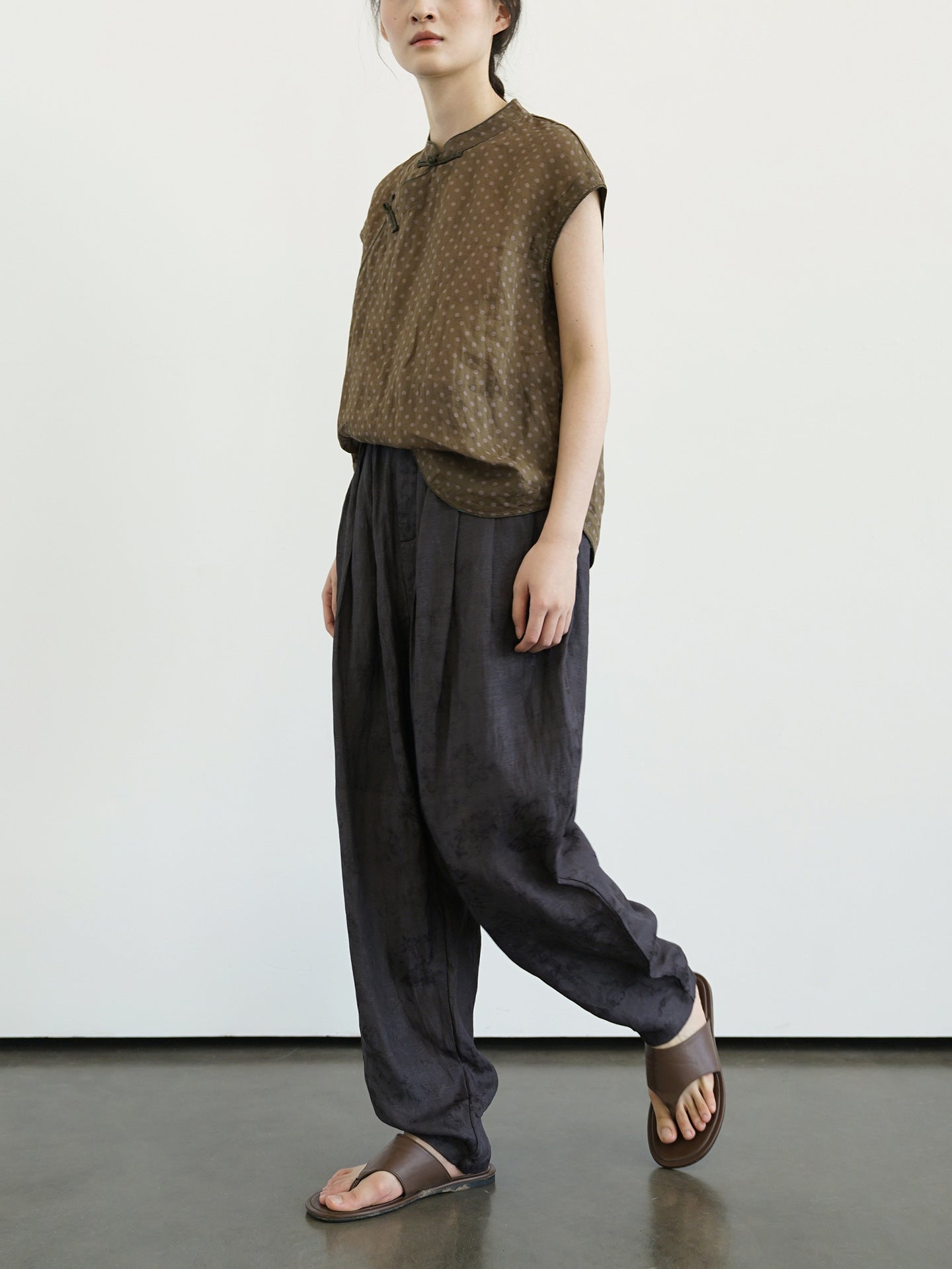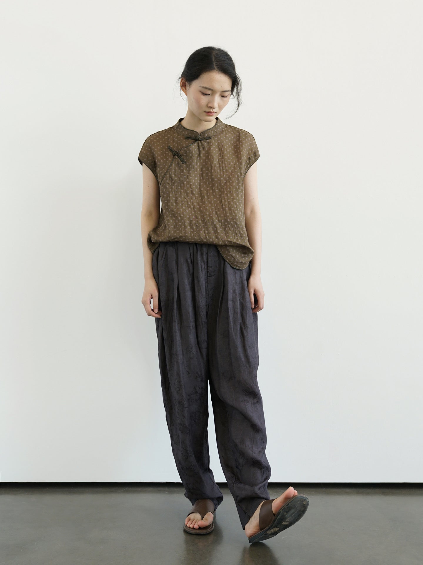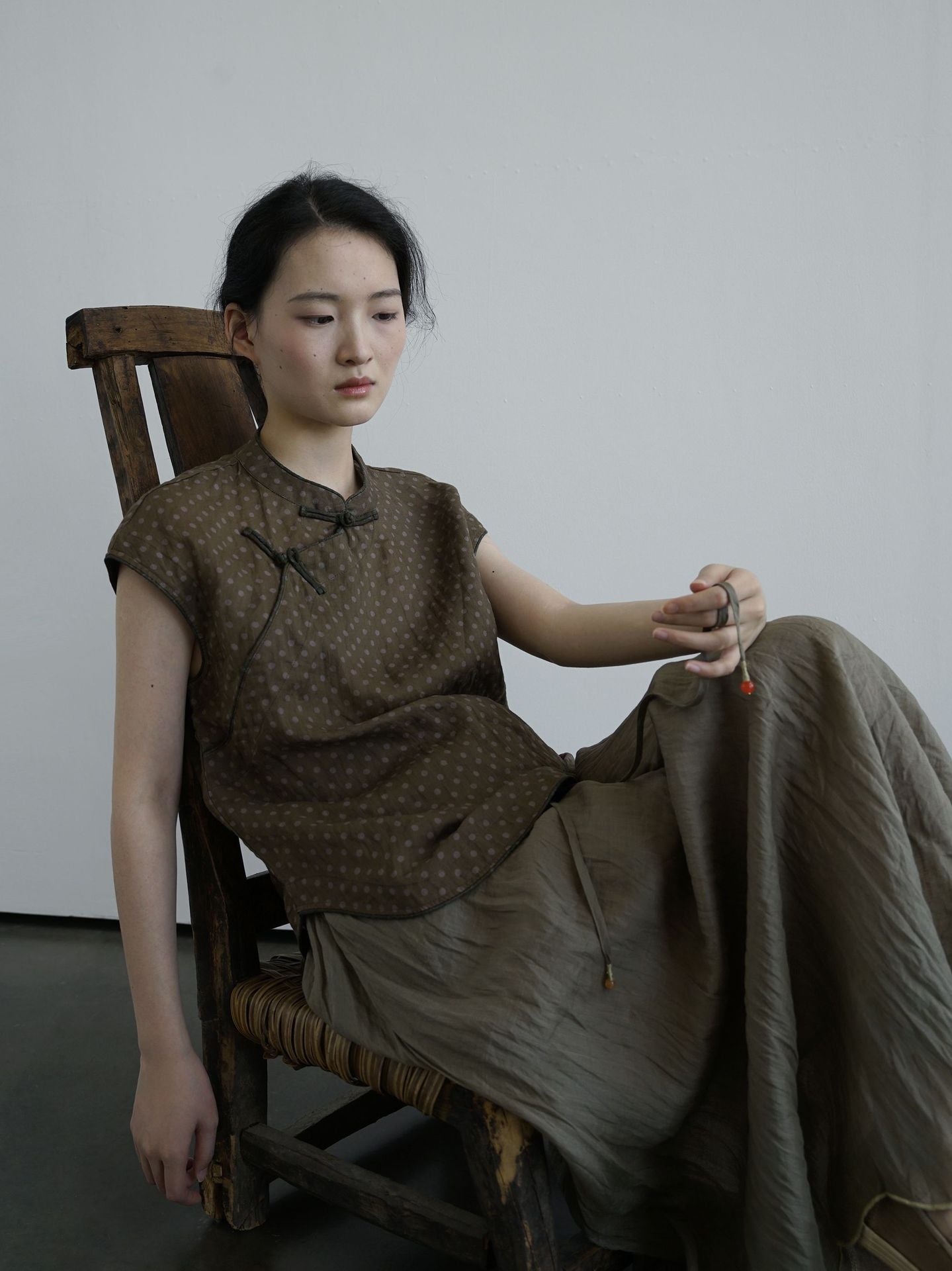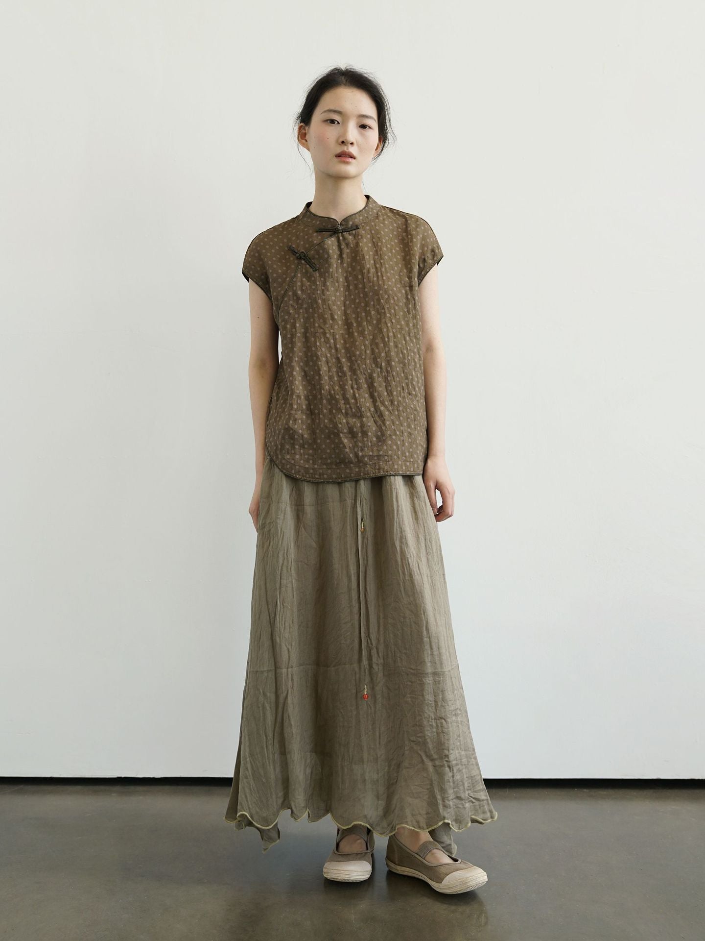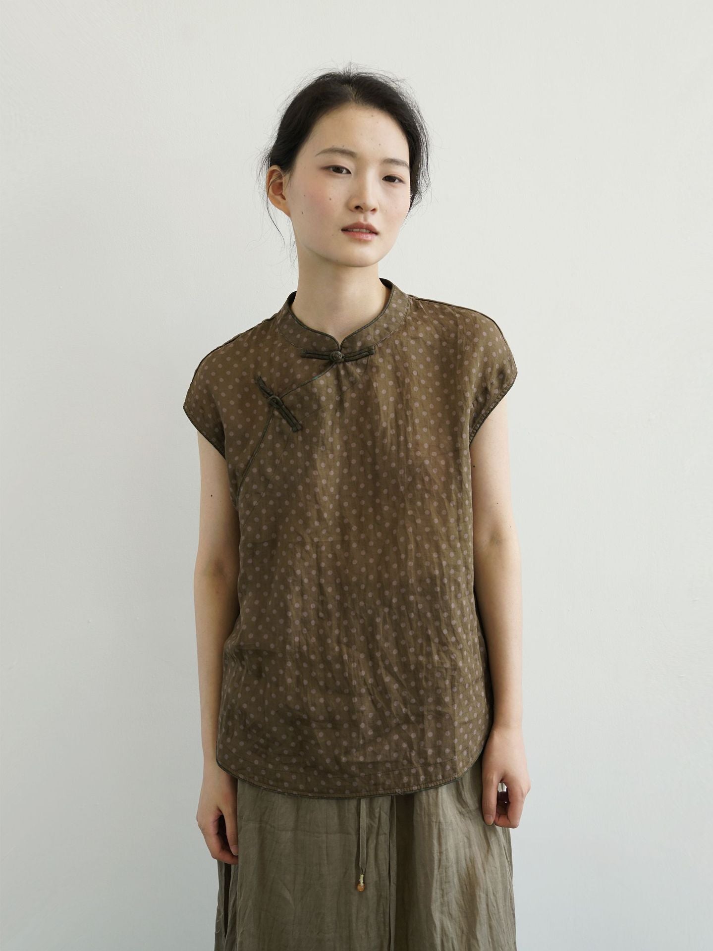 Polka Dot Cap Sleeve Cheongsam Top in Brown