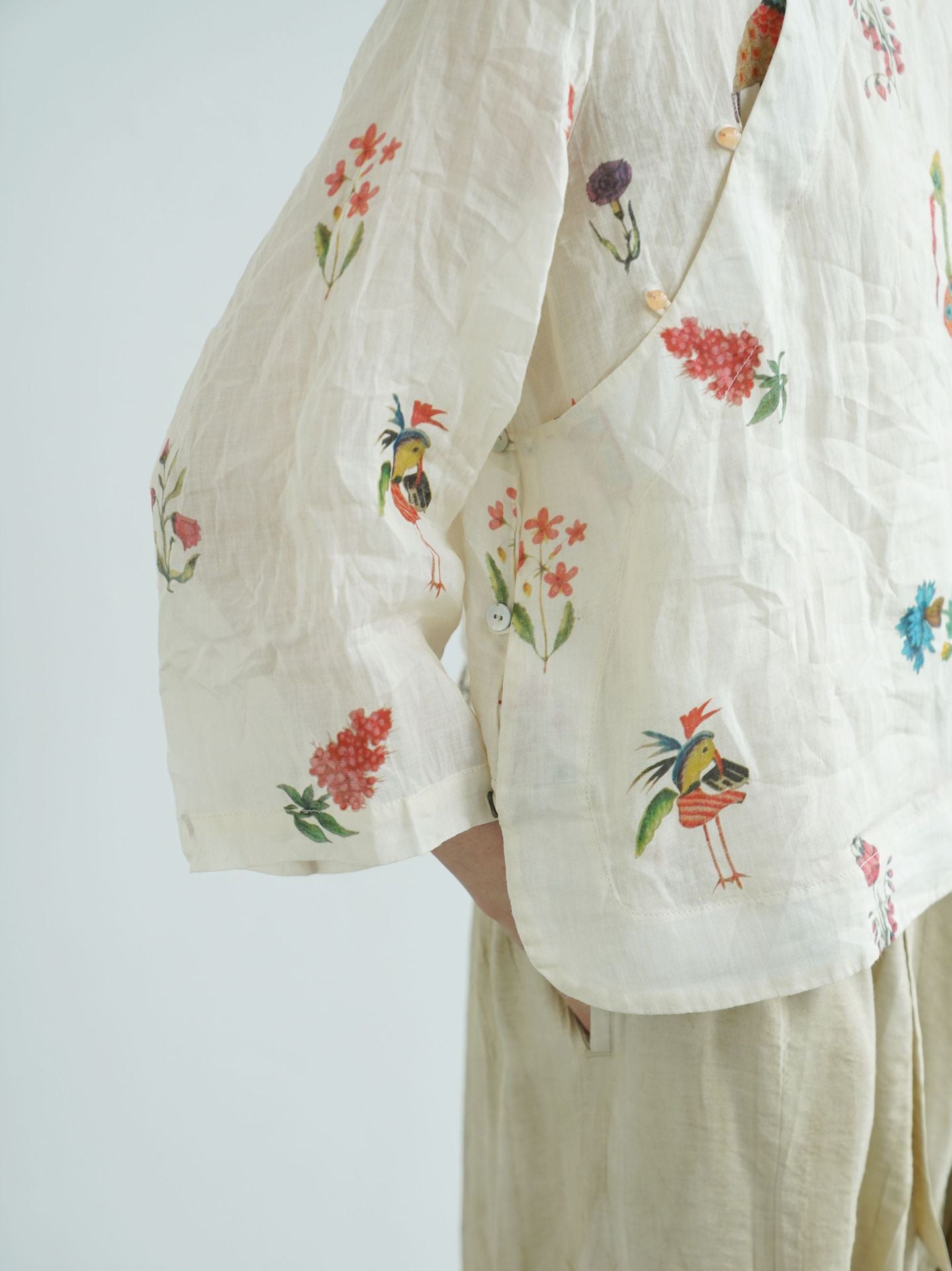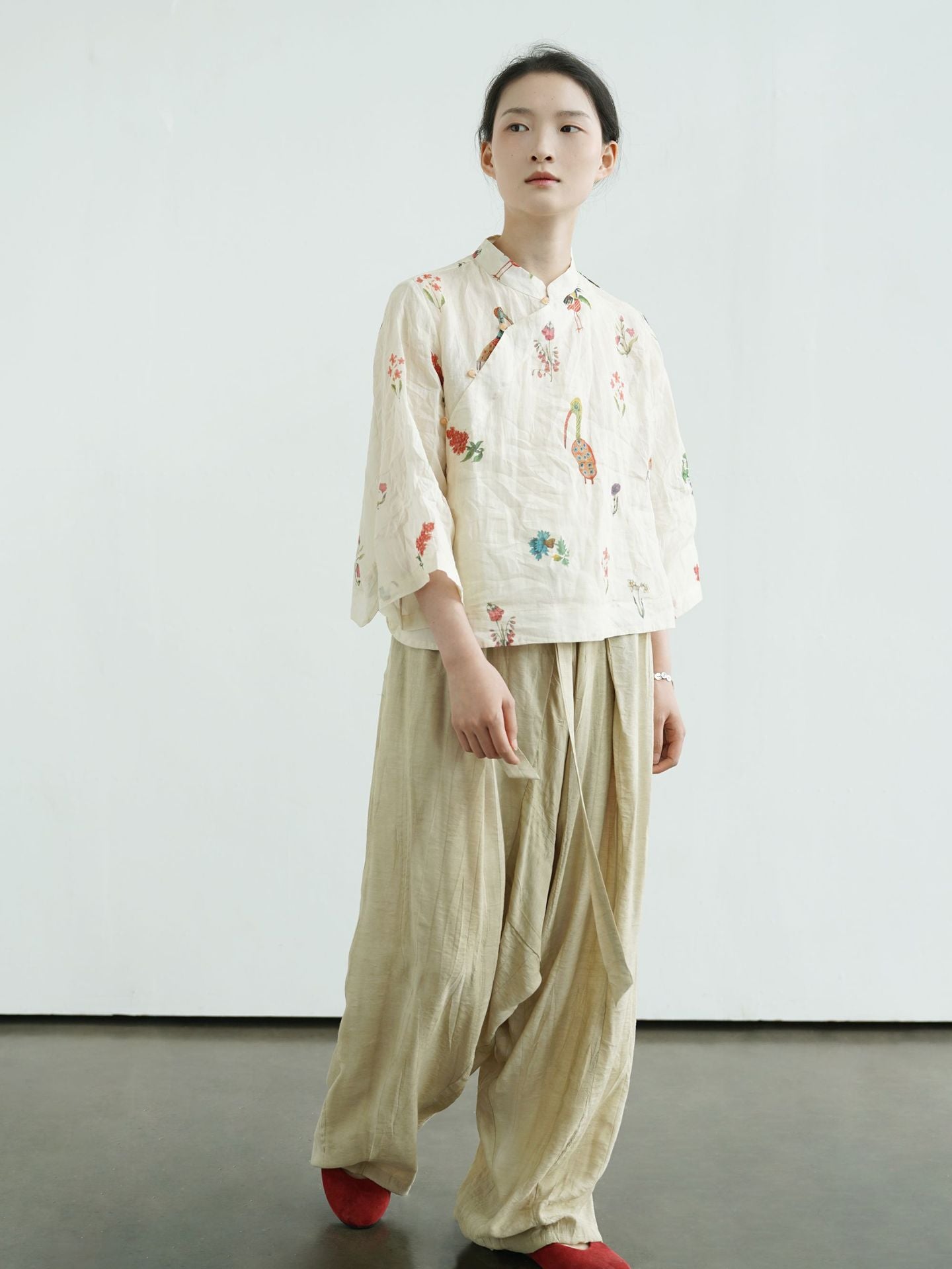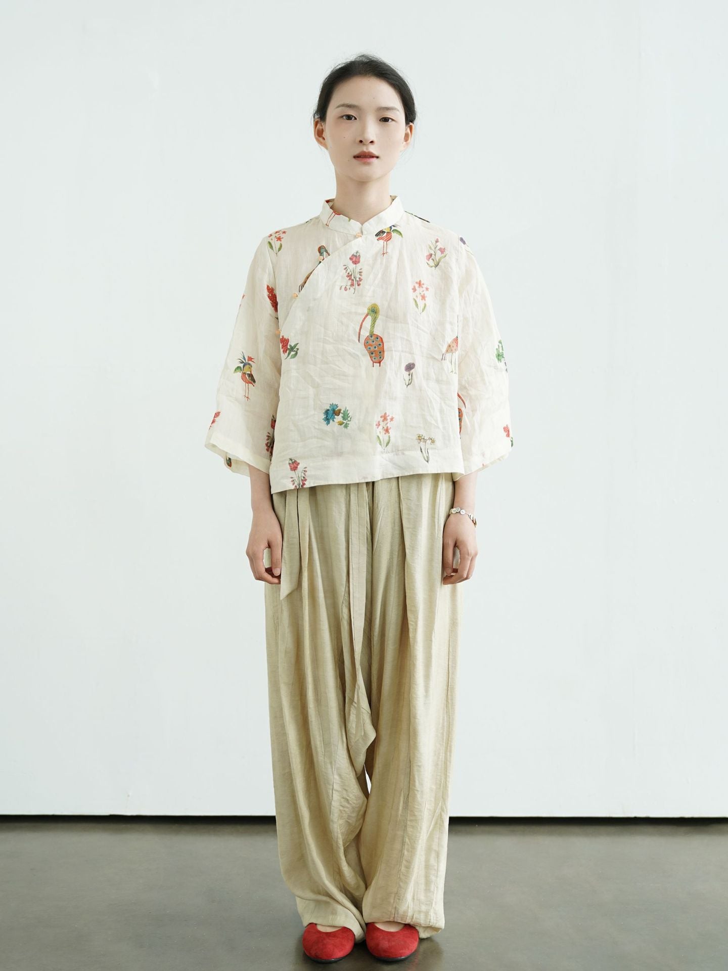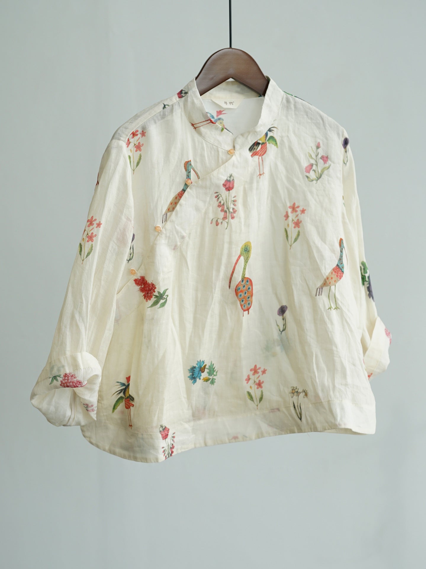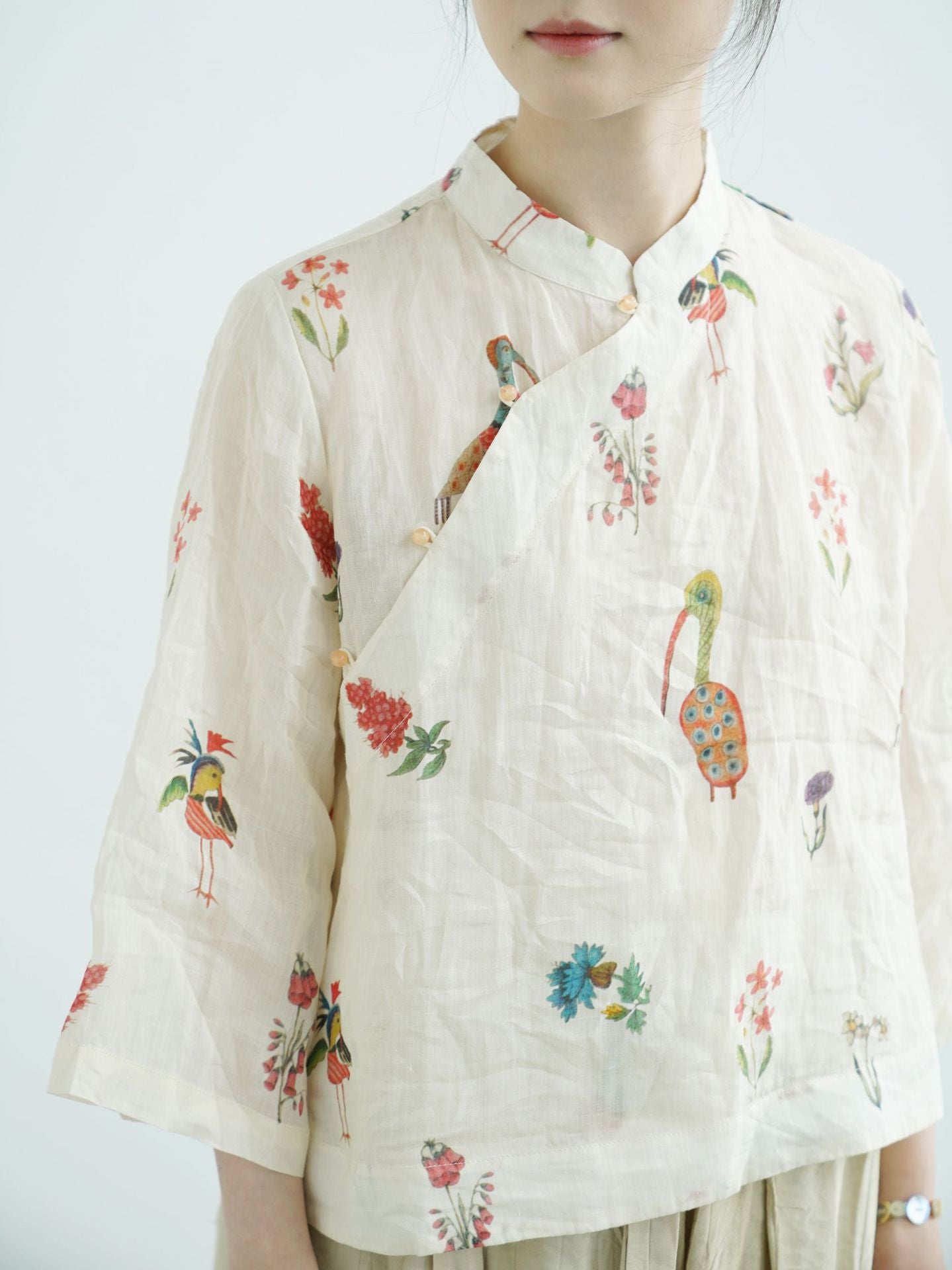 Comfortable Cheongsam top, digital print on ramie fabric.