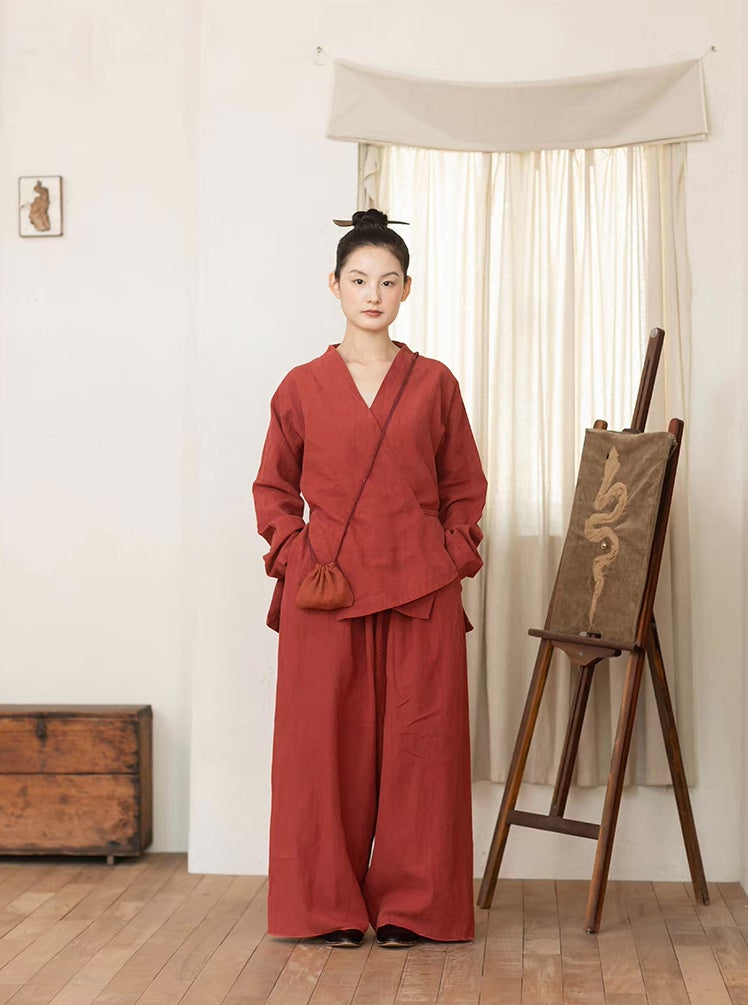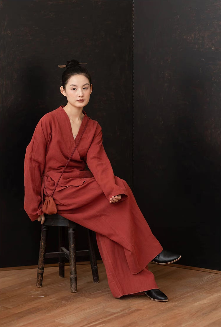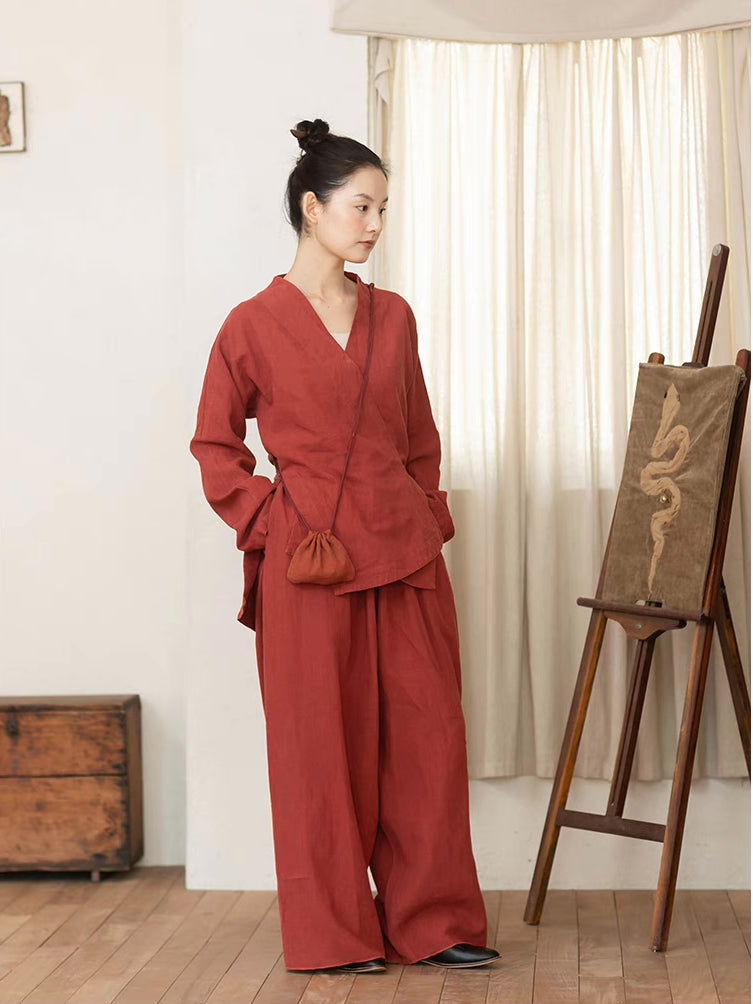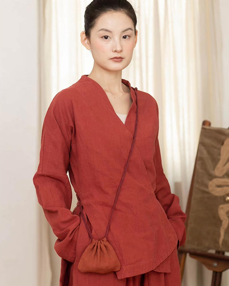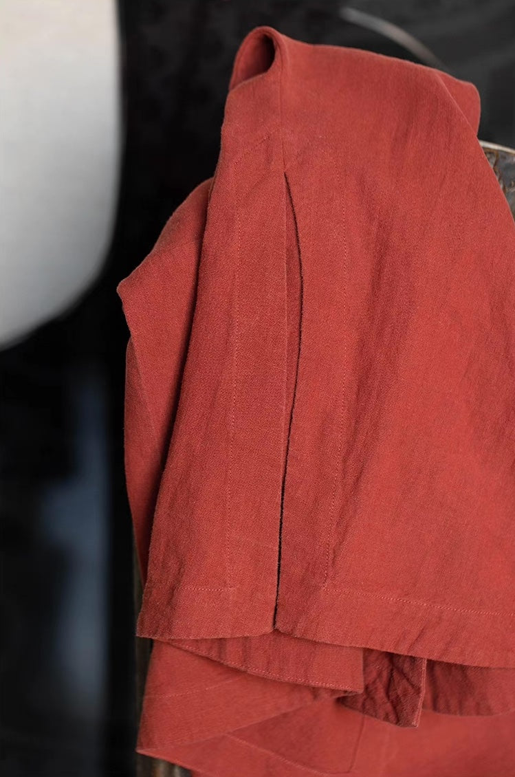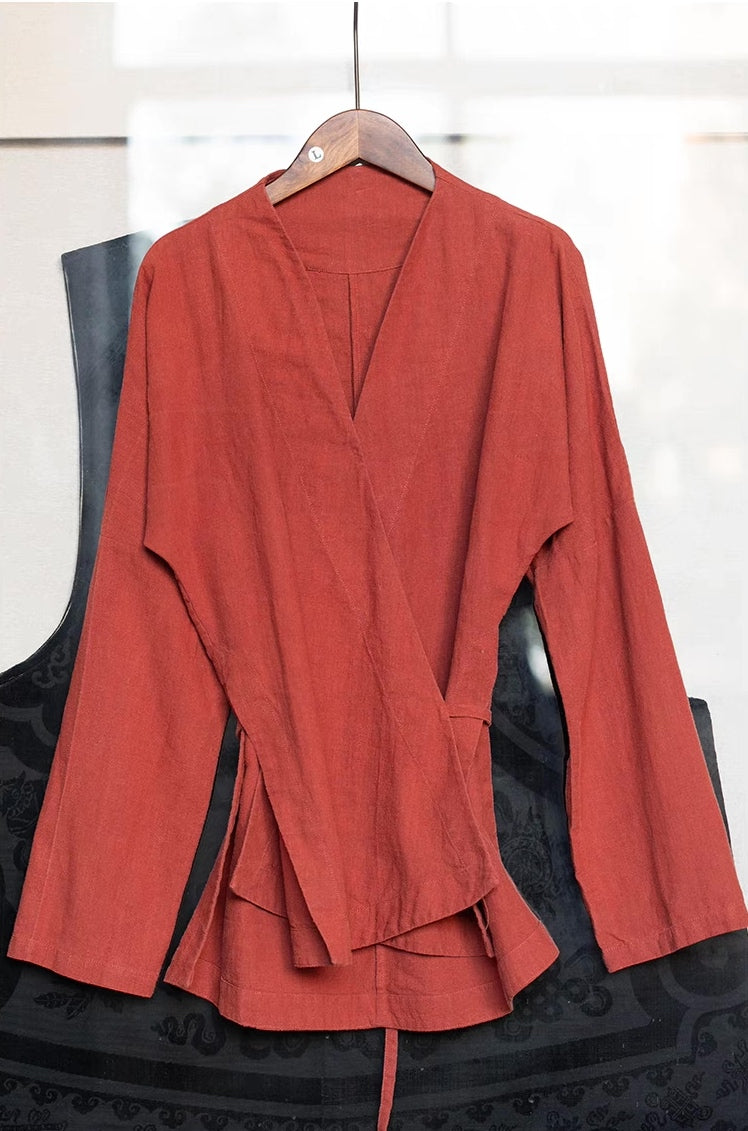 Unique Zen style samue coat. High quality wash linen is being used for the design; One front big pocket. The coat is genderless and can be worn as an outer or as a top.